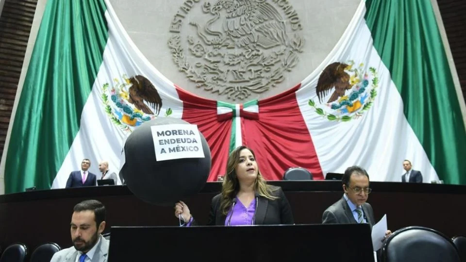 Diana Gutiérrez Valtierra, diputada del PAN, subió a la tribuna con un globo negro que simbolizaba la deuda. “Uno de los puntos más alarmantes en este proyecto de ingresos es el incremento de la deuda pública, cortesía de Morena”, afirmó.