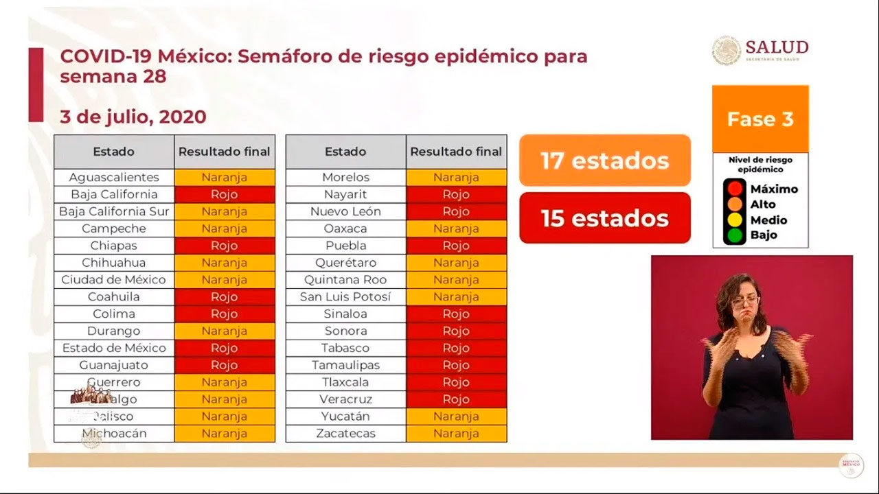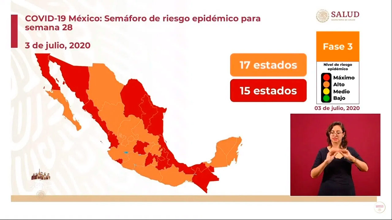 Ciudad de México. Índice Político.- Durante su conferencia diaria para informar la situación de Covid 19 en nuestro país, el subsecretario de Salud, Hugo López-Gatell señaló que el semáforo epidémico indica que 17 estados del país estarán en color naranja, mientras que 15 permanecerán en riesgo máximo durante la semana del 6 al 12 de julio.