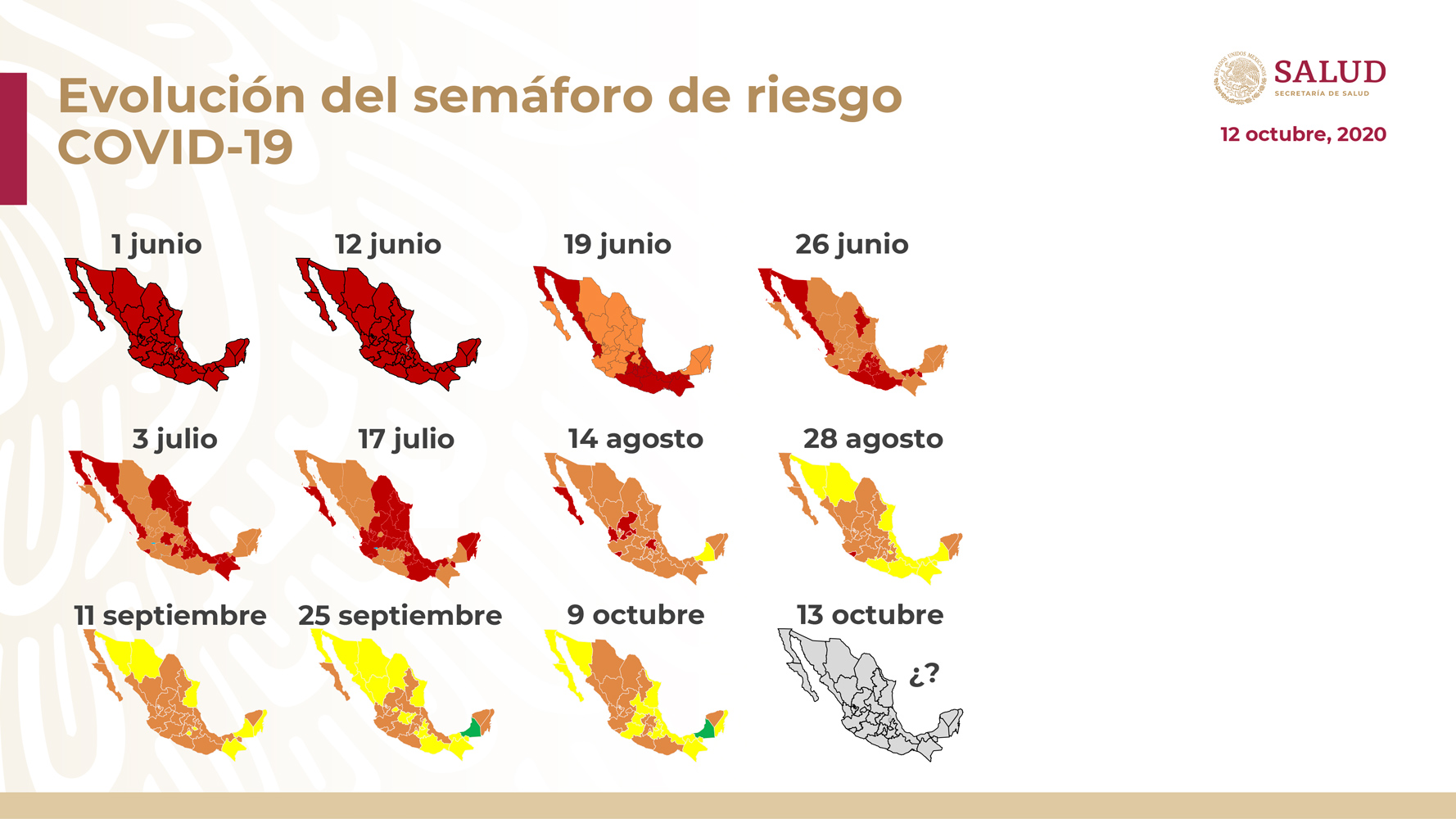 MÉXICO.- Esta segunda semana de octubre México avanza con 17 estados en semáforo naranja y registra 817 mil 503 casos confirmados de coronavirus, de los cuales, 139 mil 542 están activos.