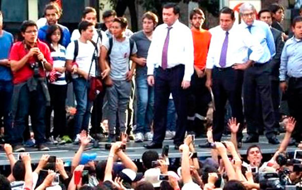 — Se escucha de la algarabía marchante politécnica al recibir en el templete al Secretario de Gobernación Miguel Ángel Osorio Chong.