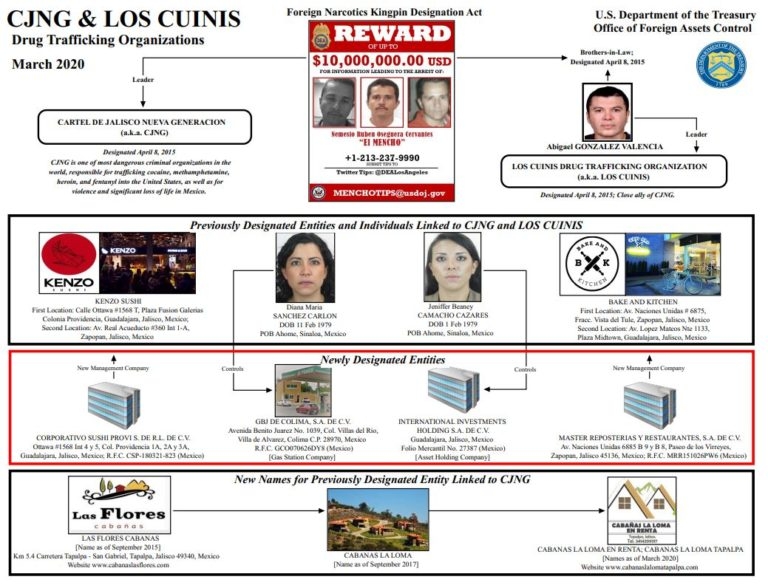 Cabe destacar que además, la Oficina de Control de Bienes de Extranjeros identificó a Cabañas La Loma en Renta y Cabañas La Loma Tapalpa, como dos nuevos nombres para un negocio de alquiler de estos espacios ubicado en Tapalpa, Jalisco, que fue señalado el 17 de septiembre de 2015 por proporcionar asistencia material a las actividades de tráfico de drogas del CJNG.