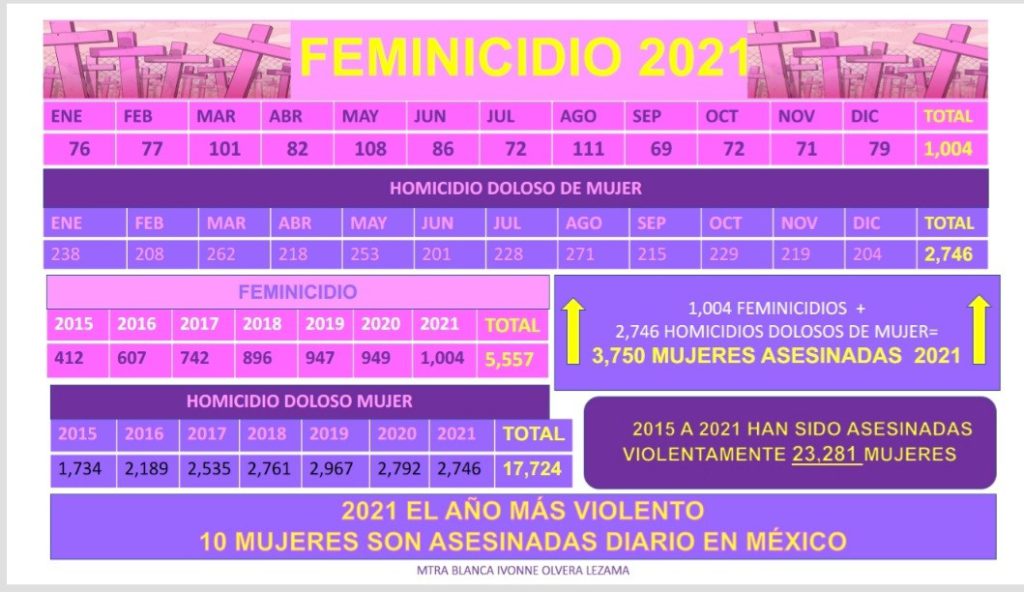Desde su perspectiva estamos ante una verdadera deshumanización, fomentada por el discurso oficial. En 2021 fue un año donde se registraron más de mil feminicidios, cosa que no sucedía desde 2015. El reporte Impunidad en homicidio doloso y feminicidio en México 2020 , presentado por la organización Impunidad Cero en noviembre pasado, revela que el 91.4% de los feminicidios en el país no fueron resueltos.