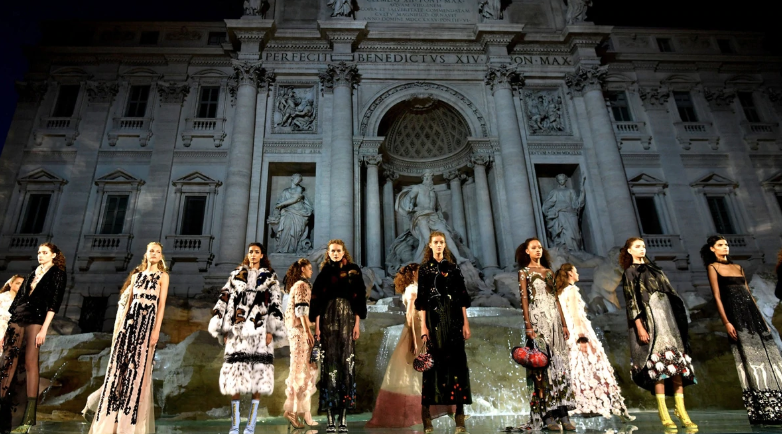Catalogado como una de las pasarelas más hermosas de todos los tiempos, este año marcó el 50 aniversario de Karl en la casa italiana y lo celebró transformando la famosa Fontana di Trevi en la locación perfecta para mostrar sus diseños.
