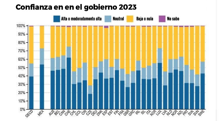 La OCDE informó que el 54% de los mexicanos expresó una confianza alta o moderadamente alta en el gobierno federal, superando el promedio de la OCDE de 39%. Además, los mexicanos confían más en la policía (58%) y en otras personas (56%) que en el gobierno federal, aunque esta diferencia es menor en comparación con otros países.