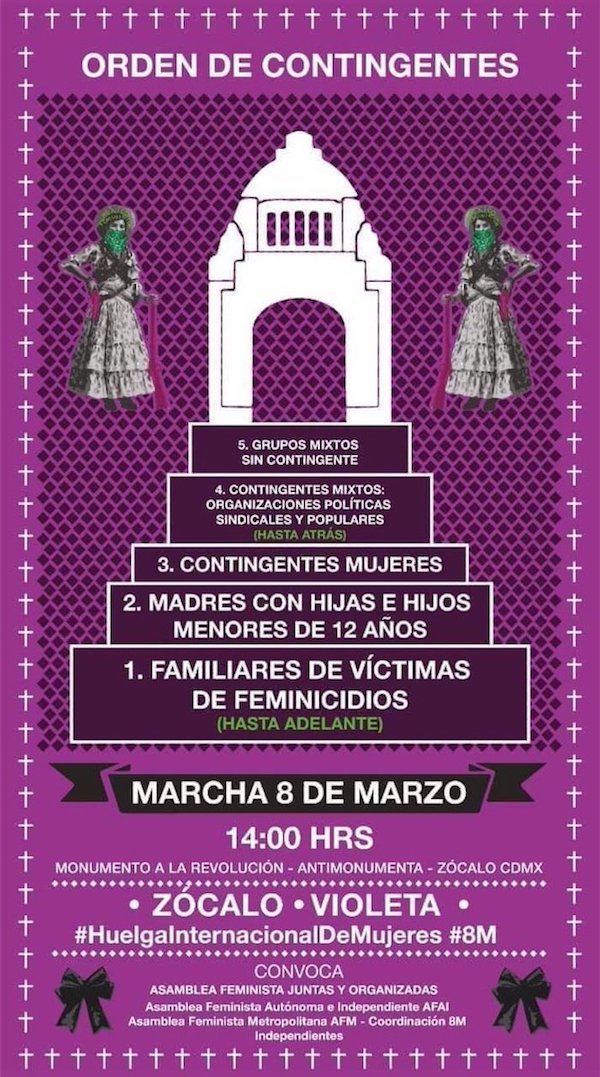 • Contingente 1: Este encabezará la marcha y estará integrado por familiares de victimas de feminicidio.