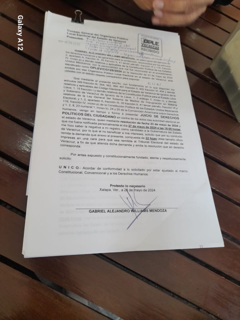 A fin de dar a conocer las acciones que emprenderá como consecuencia a la negativa del Organismo Público Electoral (OPLE) en Veracruz a su solicitud de registro como candidato a gobernador del estado, Gabriel Alejandro Williams Mendoza, presentó la reclamación de la protección de sus derechos políticos electorales.