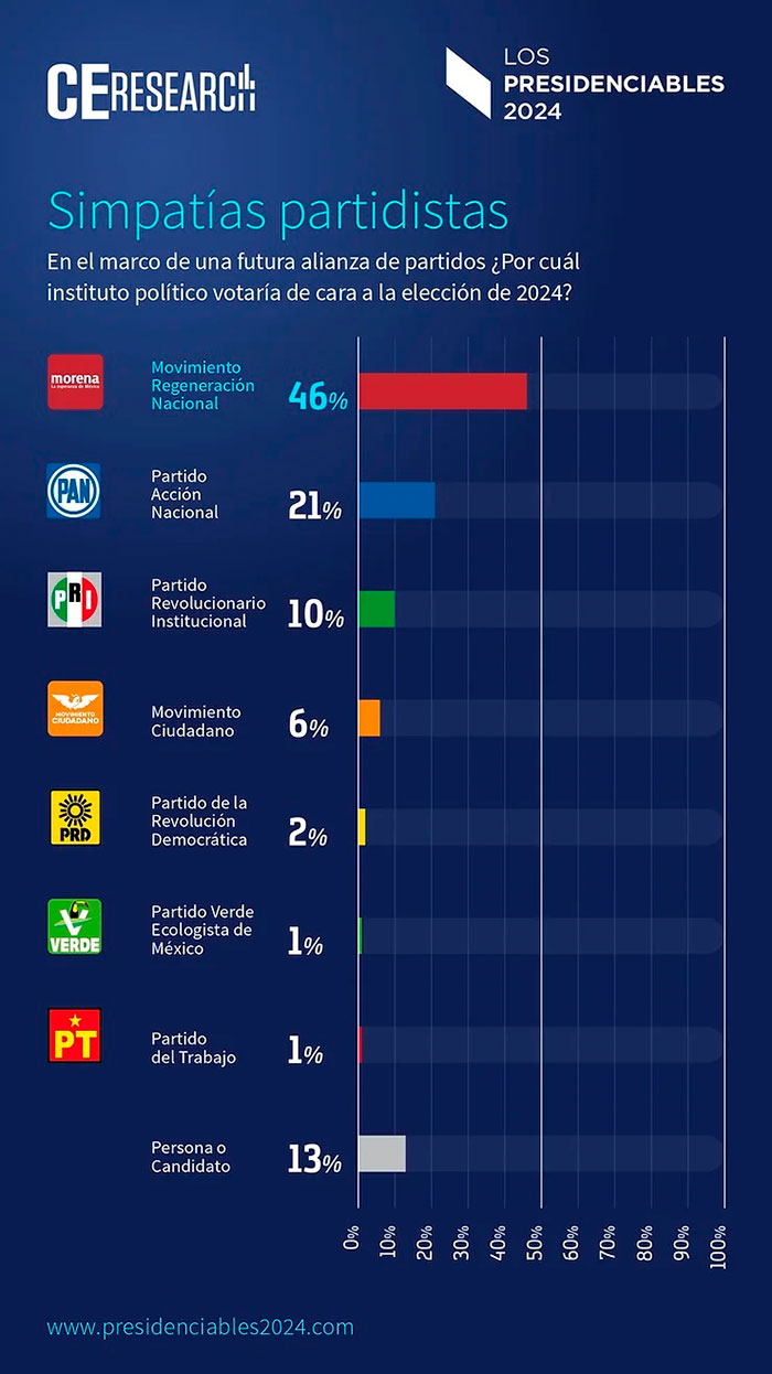 Según refiere el estudio demoscópico que si fuera hoy la elección ¿Por qué instituto político votaría de cara a la elección del 2024? 46% por Morena, 21% por el PAN, 10% por el PRI, 6% por Movimiento Ciudadano (MC), 2% por el PRD, 1% por el PVEM, 1% por el PT, 13% votará por la persona o candidato.