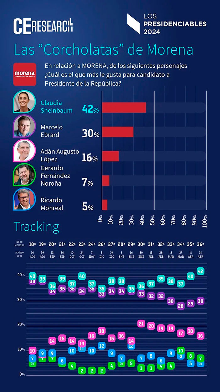 Cuando la empresa encuestadora cuestiona quién de las corcholatas de Morena es su favorita el estudio posiciona con un 42% a Claudia Sheinbaum, 30% Marcelo Ebrard, 16 % para Adán Augusto López, 7% para Gerardo Fernández Noroña, y 5% a Ricardo Monreal.