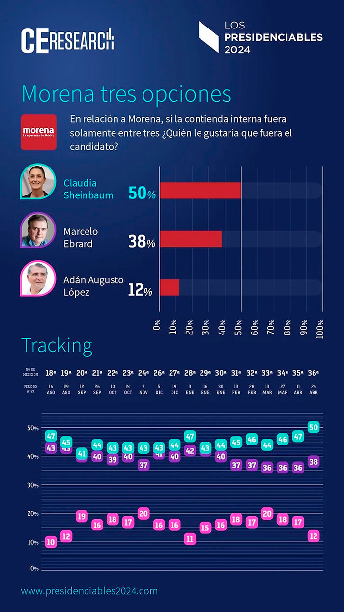 A la pregunta de ¿quién de los tres punteros le gustaría que fuera el candidato? Nuevamente Claudia Sheinbaum puntea con un 50%, le sigue Marcelo Ebrard con 38% y en tercer lugar Adán Augusto López Hernández con 12%.