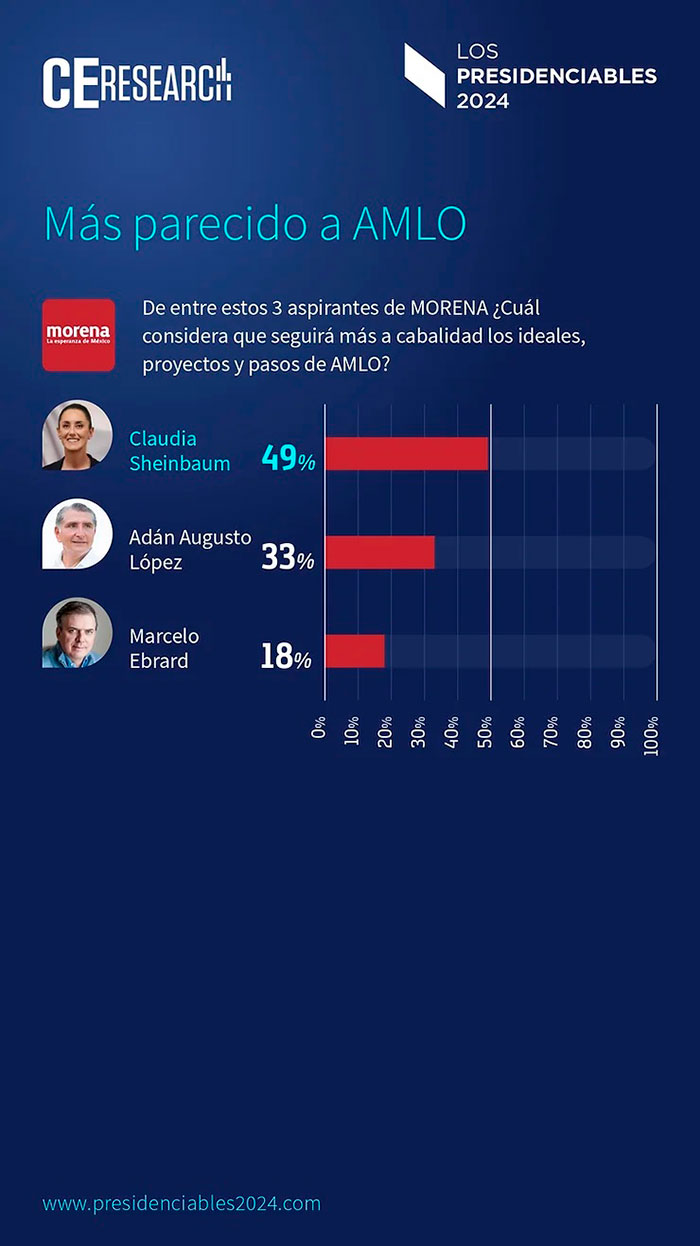 Cuando se le preguntó a la sociedad quién de estos tres candidatos garantiza la continuidad del proyecto del presidente Andrés Manuel López Obrador, resulta que nuevamente es Claudia Sheinbaum la puntera con 49%, seguida de Adán Augusto López con 33% y en tercera posición Marcelo Ebrard con 18%.