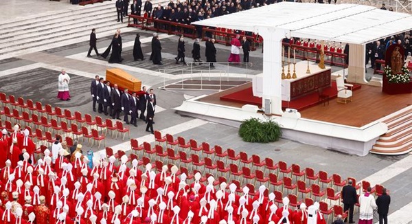 El pedido del papa argentino fue lanzado ante el sencillo ataúd de madera donde yacía el cuerpo de Joseph Ratzinger, con una copia de los Evangelios y colocado en el atrio de la basílica.