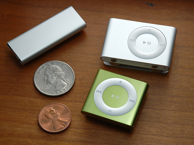 Por su parte, el iPod shuffle tuvo cuatro versiones distintas. El primero apareció en el 2005 y tenía una forma similar a una memoria USB. El segundo fue más pequeño e incorporó un clip. El tercero eliminó todos los botones y se controlaba por medio de la voz (e hizo enojar a todos). La cuarta versión es muy similar al segundo, pero más pequeño.