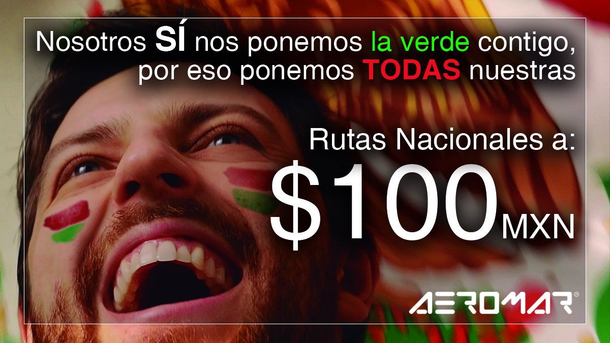 CIUDAD DE MÉXICO, 15 de septiembre (AlMomentoMX).- La aerolínea Aeromar anunció que venderá boletos de avión en 100 pesos (más impuestos) para todos sus destinos nacionales, como parte de una campaña para impulsar el turismo en temporadas bajas.