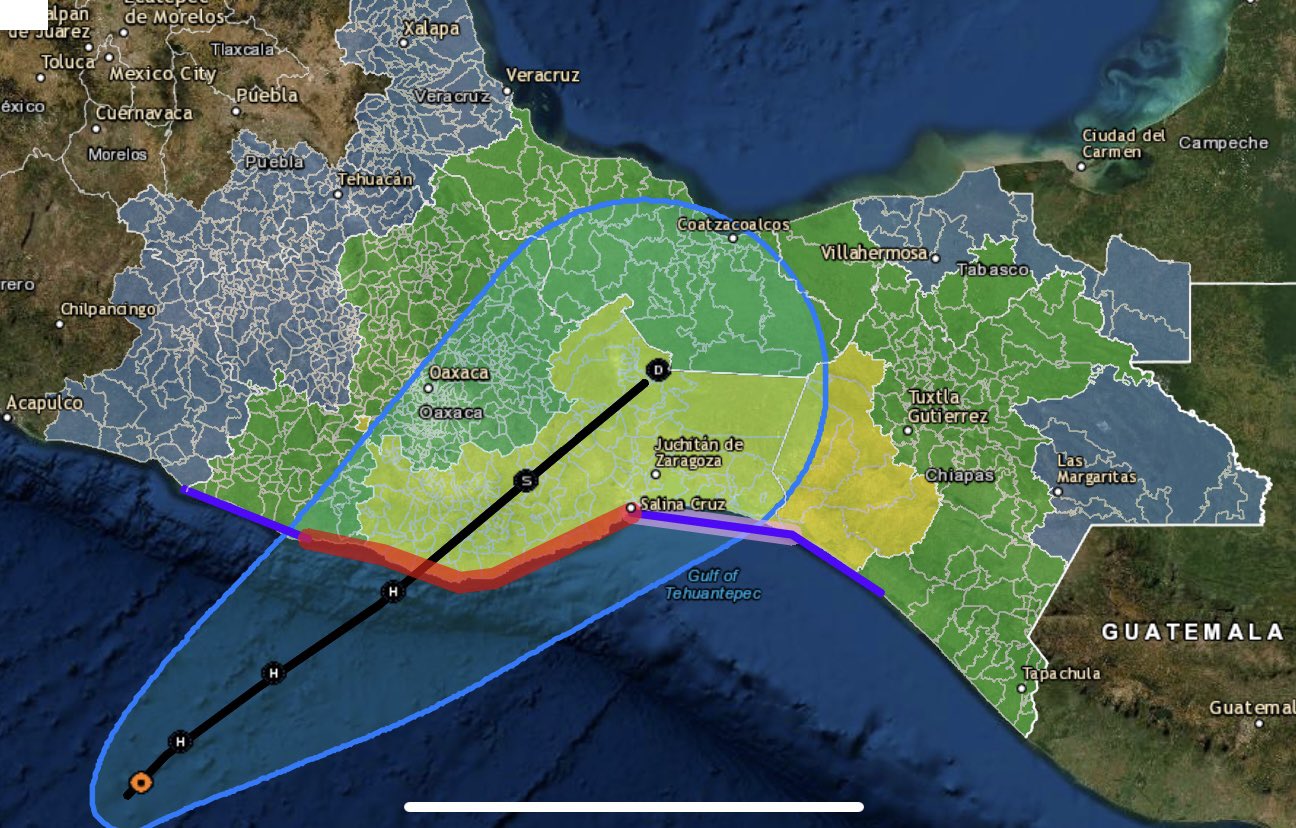 De acuerdo a lo compartido por Protección Civil, el huracán se encuentra a 240 km al sur de Punta Maldonado, Guerrero y a 315 km al oeste y suroeste de Puerto Ángel, Oaxaca y mantiene rachas de viento de 70 a 80 km/h en las costas de dichos estados.