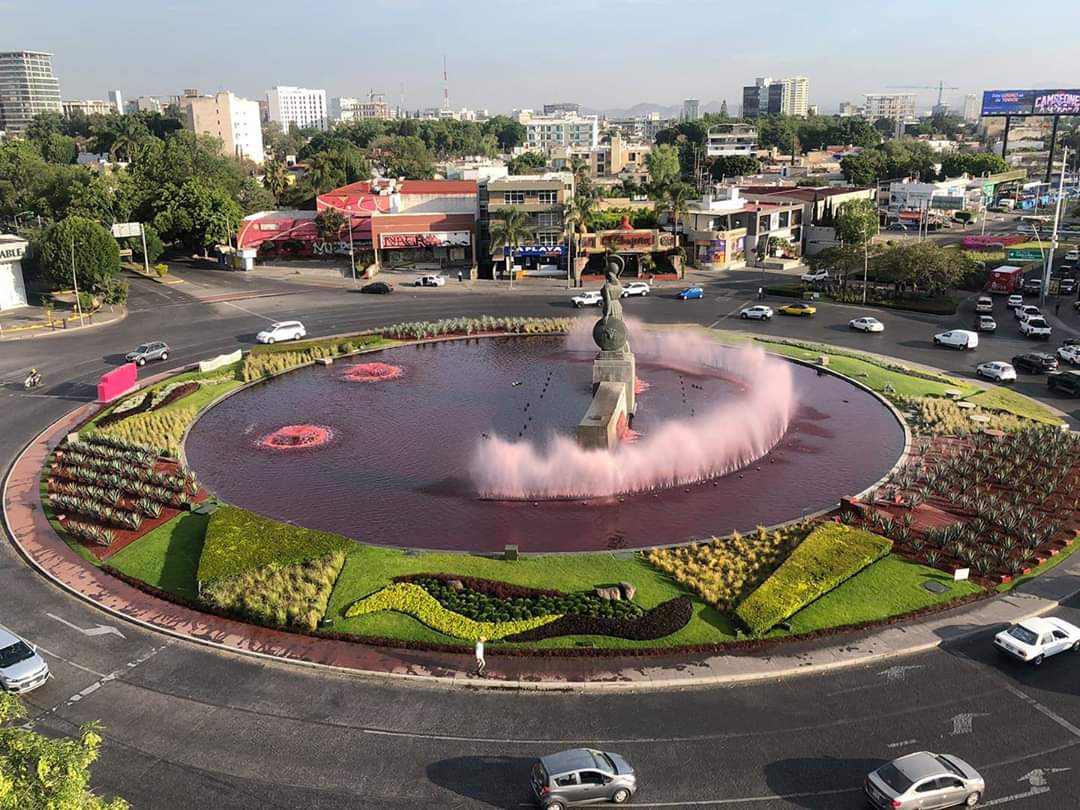 Como protesta ante feminicidios, tiñen de rojo La Minerva en Guadalajara