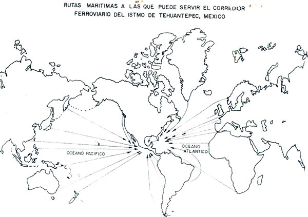 El eje rector, la línea guía original terrestre comprendía el acceso carretero y ferroviario; pero al imponerse la mayor rentabilidad a menor costo, la empresa privada FITSA concesionada por el Gobierno Federal para cobrar la interconexión y derecho de paso ferroviario por el Istmo de Tehuantepec, empezó a rehabilitar el porfiriano tendido ferroviario a fin de capitalizar el ingreso en euros y dólares por pago de peaje del comercio internacional en la Zona Libre del Istmo de Tehuantepec.