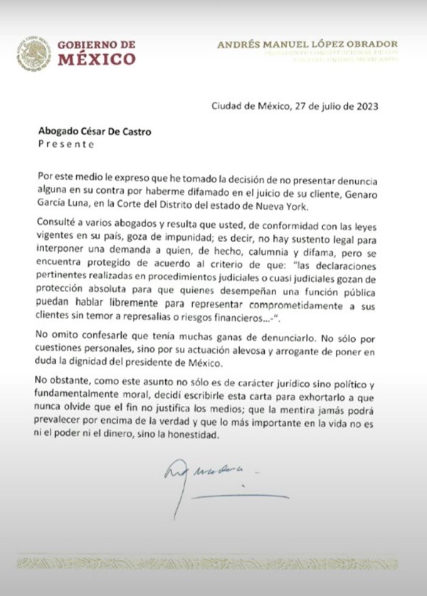 Ante lo que consideró una acusación difamatoria, el presidente López Obrador envió a César de Castro una carta que mostramos a continuación: