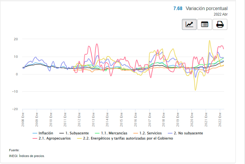 Los precios al consumidor obviamente son influidos en buena medida por el comportamiento del índice de precios productor que, en abril de 2022, incluyendo petróleo, registró un incremento mensual de 0.46% y anual de 10.35%, porcentaje que se duplicó en un año presionando fuertemente a la oferta en los mercados al menudeo.
