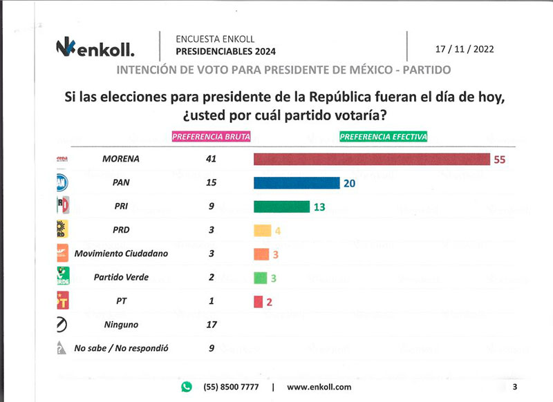 La encuesta más reciente de la encuestadora Enkoll, dada a conocer el pasado 17 de este noviembre, 55 de cien electores votarían por Morena, 20 por el PAN y 13 por el PRI. Al PRD, MC, Verde y PT apenas le alcanzarían los votos para no perder su registro ante los órganos jurisdiccionales que organizan los procesos electorales. Afortunadamente para el Verde y el PT son socios de Morena.