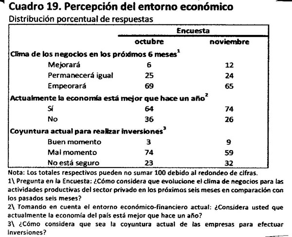 El cambio de percepciones empresariales se hizo notar en la encuesta levantada por el Banco de México en noviembre entre los analistas asesores de una treintena de muy influyentes corporaciones empresariales, tanto mexicanas como extranjeras, que operan en México.