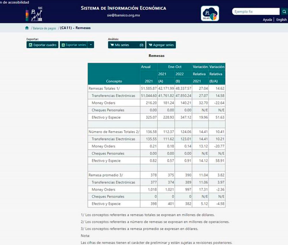 De acuerdo con los registros del banco central, en el periodo enero – octubre de 2022, el valor de los ingresos por remesas resultó de 48,338 millones de dólares, monto mayor al de 42,172 millones de dólares reportado en igual lapso de 2021 y que significó un avance anual de 14.6%.