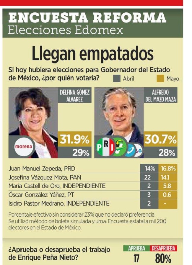 El diario Reforma ha hecho un buen trabajo de encuestas y de seguimiento de la estira y afloja entre Delfina Gómez Álvarez y Alfredo del Mazo Maza, por la gubernatura del estado de México.