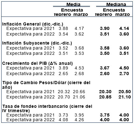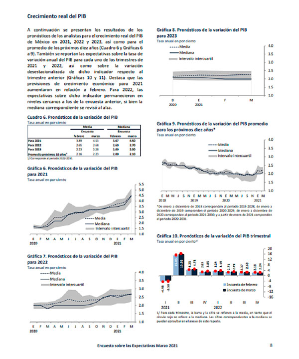 El Banco de México reportó este lunes 5 de marzo expectativas razonables, relativas al comportamiento de la pandemia, que aún no permite abrir la economía y que no da certezas de que acabe a corto o mediano plazo, de la treintena de economistas empresariales (las más importantes corporaciones nacionales y extranjeras), que consulta mes con mes en torno al comportamiento de las principales variables de la economía: Inflación, Producto Interno Bruto, Tipo de Cambio y Tipos de interés.