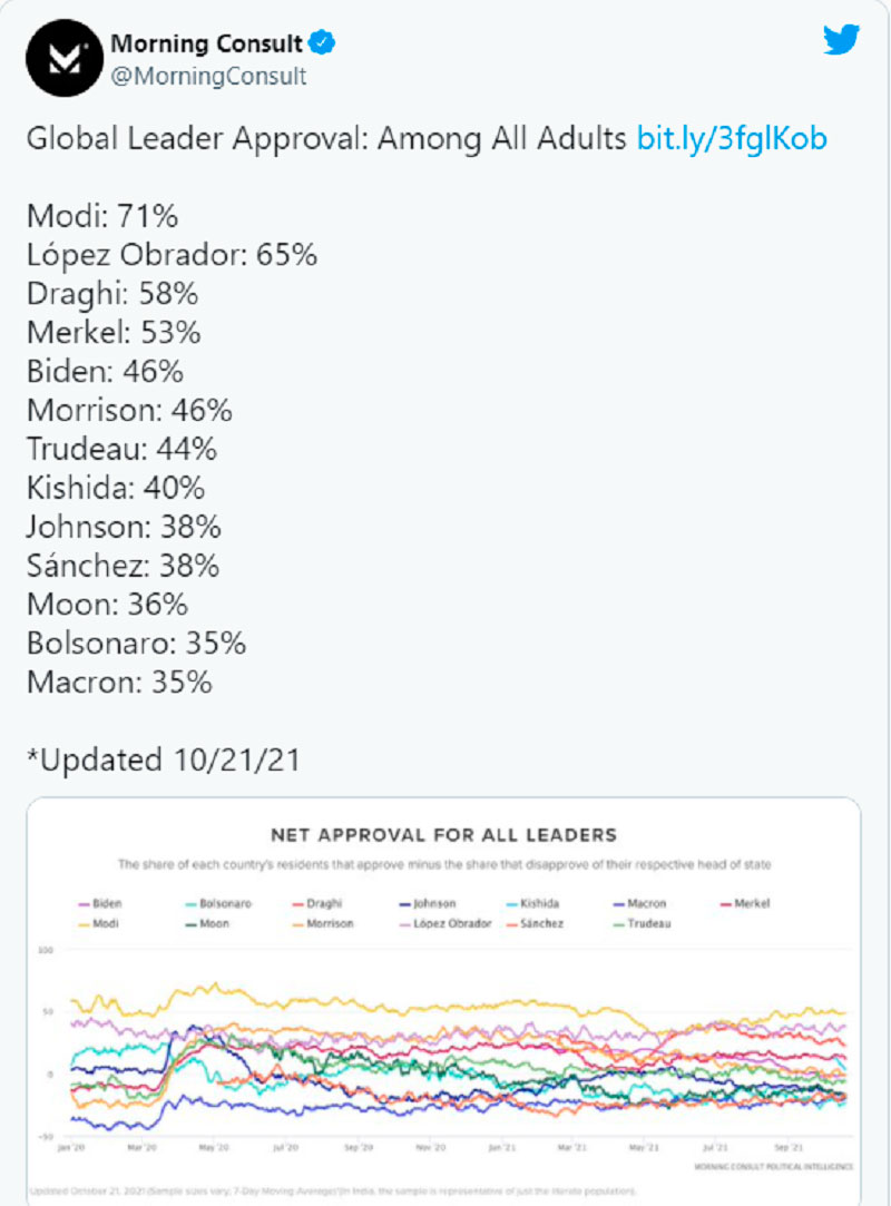 Morning Consult indica que rastrea, semanalmente, el índice de popularidad de los líderes gubernamentales en Australia, Brasil, Canadá, Francia, Alemania, India, Italia, Japón, México, Corea del Sur, España, Reino Unido y Estados Unidos y los resultados se pueden consultar en su página.