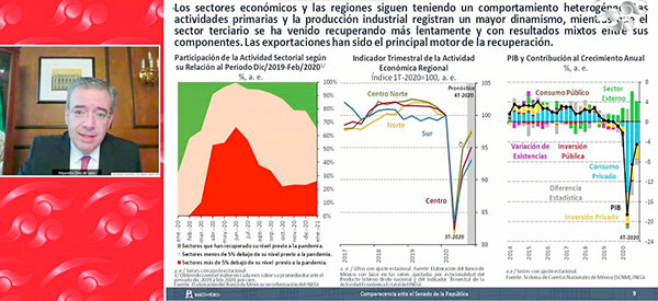 La región norte y centro del país ha tenido un mejor desempeño, en relación con la zona sur, y el sector externo es el que “realmente ha contribuido” a la recuperación económica de México. Palabras del banquero central.