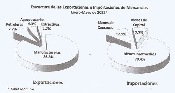 Por el lado de las importaciones, la estructura del valor, en los primeros cinco meses de 2022, es el siguiente: bienes de uso intermedio, 79.4%; bienes de consumo, 12.9% y bienes de capital 7.7%.