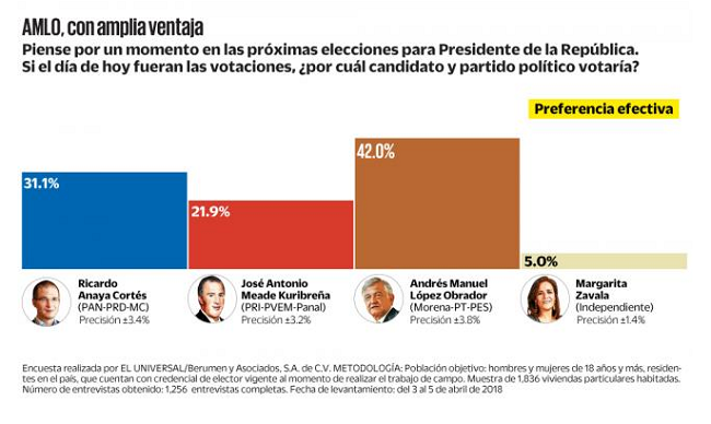El resentimiento de la mayoría puede verse en todas las encuestas sobre preferencias electorales, en las que el candidato del Movimiento de Regeneración Nacional (Morena), Andrés Manuel López Obrador, arrasa con los candidatos oficialistas, Ricardo Anaya, del PAN y sus partiditos satélites, el PRD y el MC, y el candidato del PRI, el panista José Antonio Meade Kuribreña.