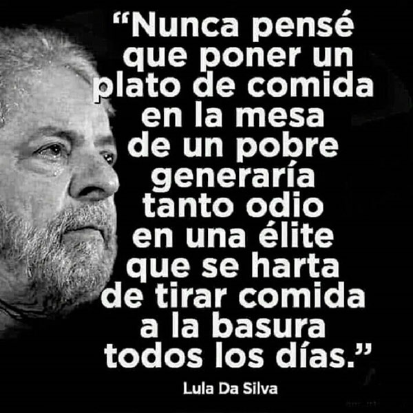 Duele la interpelación de Lula. Demuestra el brasileño la miseria humana de muchos miembros de las clases dominantes. Me tocó ver en algún pueblo rural de los Estados Unidos – el corazón del capitalismo salvaje- cómo, todos los días, a la hora de cada comida, los servidores, meseros, desechaban, en los botes de basura, la comida sobrante, no tocada, las botellas sin abrir de aceites finos, de salsas, las carnes finas, alimentos de todo tipo. Y esto ocurría en un hotel de “campesinos” (farmers). ¡Imagine un hotel de lujo!