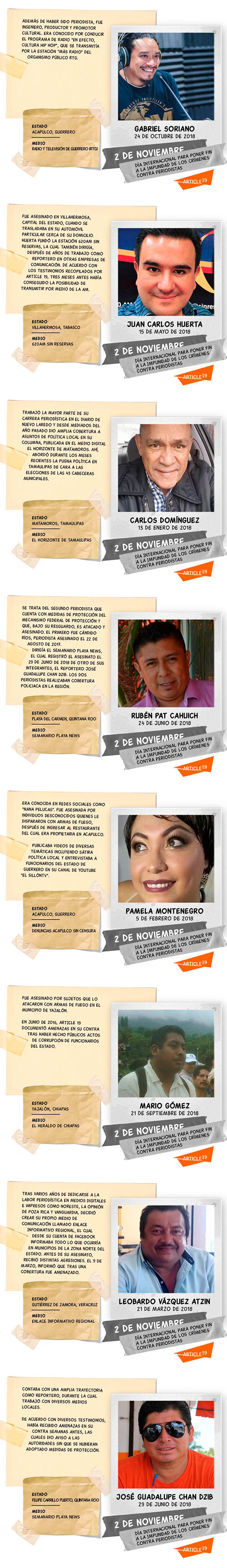 Este año de 2018, último del sexenio del presidente Enrique Peña Nieto, quien hizo caso omiso del sufrimiento de los familiares de las víctimas y dedicó pingües presupuestos a enriquecer a los “periodistas” a modo, a los que me referí al principio de esta noca, fueron ocho reporteros los asesinados por criminales impunes ad aeternum: Carlos Domínguez, Pamela Montenegro, Leobardo Vázquez Atzin, Juan Carlos Huerta, José Guadalupe Chan Dzib, Rubén Pat Cahuich, Mario Gómez y Gabriel Soriano son los nombres de los periodistas asesinados en el último año de Gobierno de Enrique Peña Nieto. La cifra de periodistas asesinados durante todo el sexenio es de 47 de acuerdo con las estadísticas de la organización defensora de los periodistas, Artículo 19. No estoy contando la cifra histórica.
