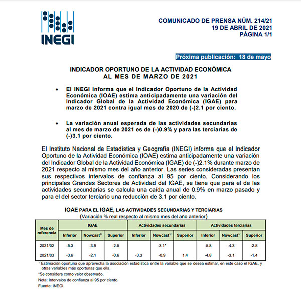 El Inegi informa que el llamado Indicador Oportuno de la Actividad Económica (IOAE) estima anticipadamente una variación del Indicador Global de la Actividad Económica (IGAE), para marzo de 2021 contra igual mes de 2020, de (-)2.1 por ciento.