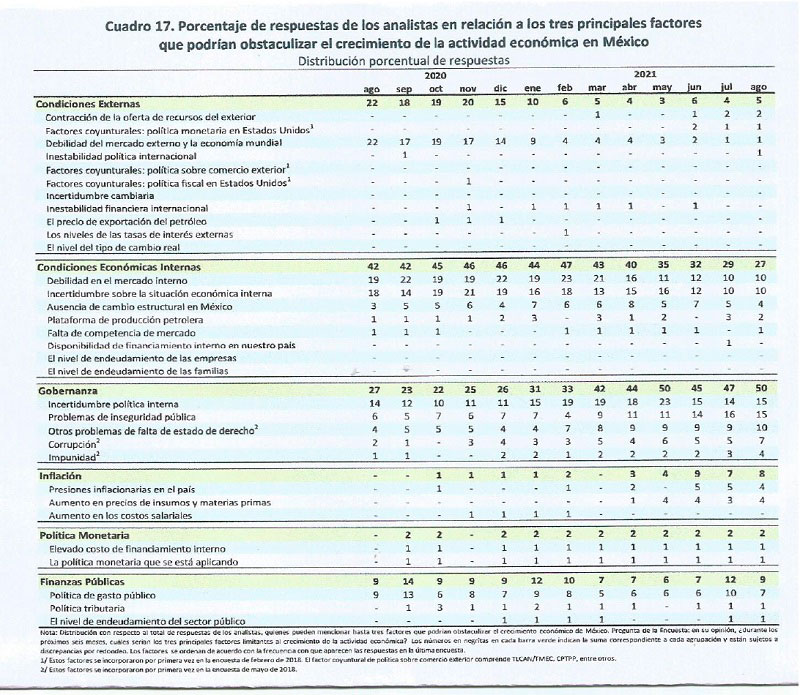 En general, de acuerdo con la Encuesta sobre las Expectativas de Especialistas en Economía del Sector Privado, levantada en agosto pasado por encuestadores del Banco de México entre asesores económicos de una treintena de grandes empresas particulares, los principales obstáculos para el crecimiento económico se asocian con la gobernanza (50%) y las condiciones económicas internas (27%).