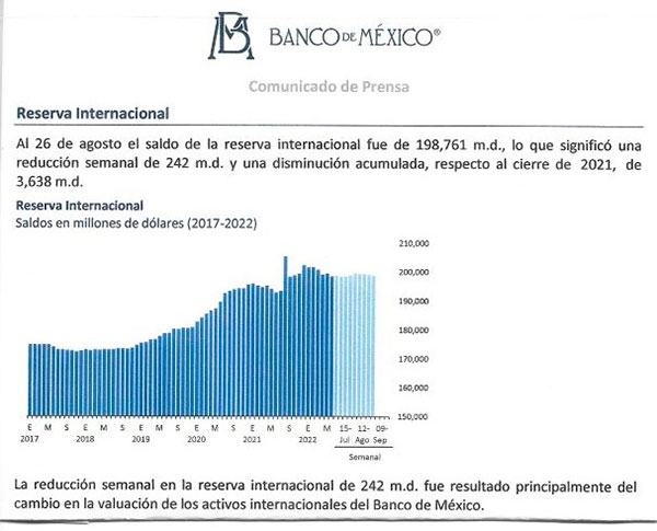 Las reservas internacionales del Banco de México, por otro lado, también se contrajeron. Al 26 de agosto, el saldo de la reserva internacional fue de 198 mil 761 millones de dólares, hecho que significó una reducción semanal de 242 millones de dólares y una disminución acumulada, respecto al cierre de 2021, de 3 mil 638 millones de dólares.