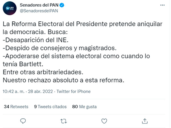 “La Reforma Electoral del Presidente pretende aniquilar la democracia. Busca: -Desaparición del INE. -Despido de consejeros y magistrados. -Apoderarse del sistema electoral como cuando lo tenía Bartlett. Entre otras arbitrariedades. Nuestro rechazo absoluto a esta reforma”, expresaron en su cuenta de Twitter. Es una reacción. Y los seres humanos, por naturaleza, no reaccionamos, sino que respondemos (con responsabilidad)