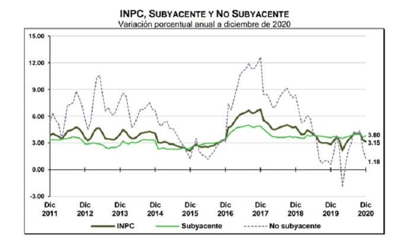 Observen en la gráfica incluida en esta nota, cómo los índices inflacionarios han venido manteniéndose relativamente bajos, en los parámetros establecidos: El mes de diciembre de 2020 cierra en 3.15% el Índice Nacional de Precios al Consumidor.