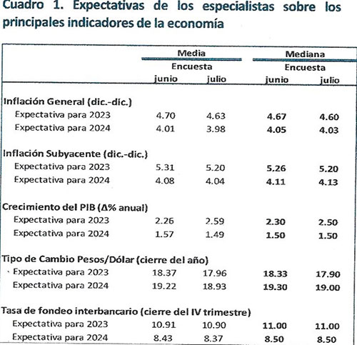 Y para tener una idea de quiénes son los encuestados, es importante regdistrar que, para la encuesta de julio, el Banxico entrevistó a los asesores económicos de las siguientes entidades empresariales: Action Economics; Banco Actinver; Bank of America Merrill Lynch; Banorte Grupo Financiero; Barclays; BBVA; BNP Paribas; Bursamétrica Management S.A. de C.V.; BX+; Capital Economics; Centro de Estudios Económicos del Sector Privado, A. C.; CIBanco; Citibanamex; Consejería Bursátil; Consultores Internacionales; Credicorp Capital; Finamex, Casa de Bolsa; HARBOR economics; HSBC; Invex Grupo Financiero; Itaú Asset Management; Itaú Unibanco; JP Morgan; Monex, Grupo Financiero; Morgan Stanley; Multiva, Casa de Bolsa; Natixis; Prognosis, Economía, Finanzas e Inversiones, S.C.; Raúl A. Feliz & Asociados; S&P Global Market Intelligence; Santander, Grupo Financiero; Scotiabank, Grupo Financiero; Signum Research; Tactiv Casa de Bolsa; Valmex; y Vector, Casa de Bolsa.