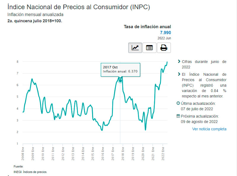 Apenas el 23 de junio, las autoridades monetarias incrementaron en 50 puntos base la tasa de interés interbancaria, para situarla en 7.75 por ciento, muy cerca del porcentaje de inflación que ya es del 8.0 por ciento, casi emparejando con el 9.1 por ciento de inflación de EU.
