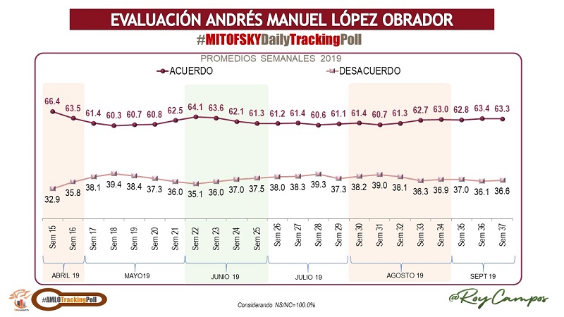 Campos le da esta semana al Presidente mexicano una aprobación promedio semanal de 63.3 (-0.1) por ciento y, para este sábado 22 de septiembre, una de 63.7 (+0.4) por ciento.