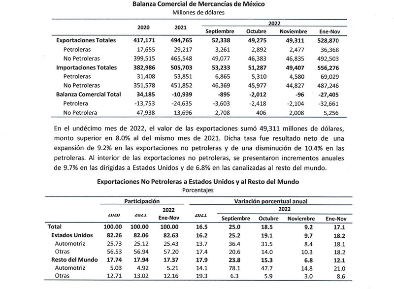 La estructura del valor de las exportaciones de mercancías, durante los primeros once meses de 2022 fue la siguiente: bienes manufacturados, 87.9%; productos petroleros, 6.9%; bienes agropecuarios, 3.7%; y productos extractivos no petroleros, 1.5%.