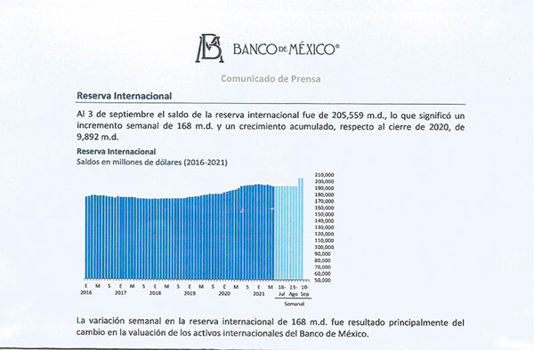Consuetudinariamente, el boletín mencionado llega a las redacciones de los medios los martes. Y este martes 7 de septiembre, el Banxico dio a conocer que, en los saldos preliminares del estado de cuenta, correspondientes al viernes 3 de septiembre de 2021, destacó un significativo aumento en las reservas internacionales y en la llamada base monetaria.