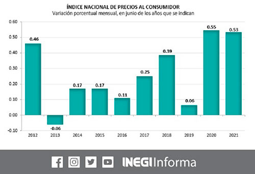 La primera institución dio a conocer, el jueves de la semana que concluyó el sábado 10 de julio, que el Índice Nacional de Precios al Consumidor sufrió un aumento considerable, de 0.53% en el mes de junio con respecto a mayo.