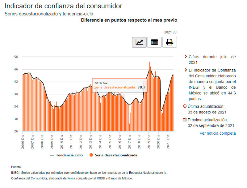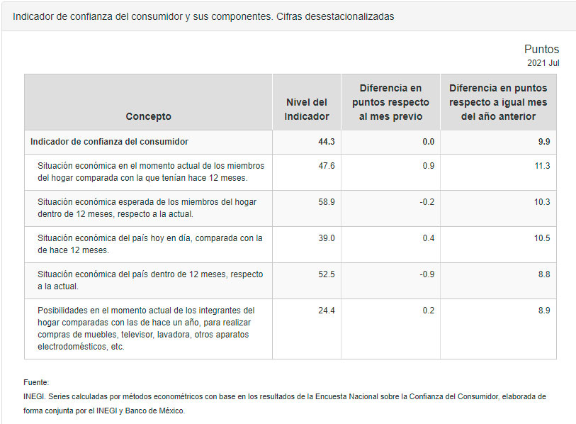 Así, este martes 3 de agosto, se dio a conocer que, en el mes de julio pasado, el Indicador de Confianza del Consumidor (ICC), elaborado de manera conjunta por el INEGI y el Banco de México, se ubicó en 44.3 puntos, mismo nivel que el reportado el mes previo.