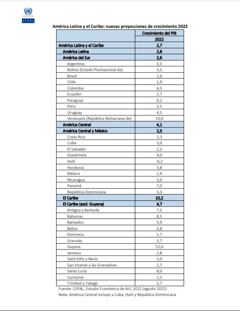 La CEPAL proyecta que América del Sur crecerá un 2.6% (en comparación con un 6.9% en 2021); el grupo conformado por Centroamérica y México, 2.5% (en comparación con un 5.7% en 2021) y El Caribe —la única subregión que crecerá más que en 2021— 4.7%, sin incluir Guyana (en comparación con un 4.0% en el año anterior).