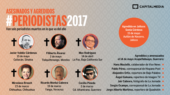 Y esta situación duele profundamente. Es vergonzoso que del primero de enero al 18 de mayo, que es este jueves – menos de cinco meses – hayan sido asesinados seis compañeros periodistas. Y no se sabe quién los mató, por qué los mató, quién – narco o político, o narco político – los mandó asesinar. En ningún caso el presidente ha cumplido su promesa. Los asesinos andan en la calle como el policía que se mueve de un lado a otro, o el marco que va y viene de su zona de influencia a la Ciudad de México que ha convertido en su centro de operaciones financieras.