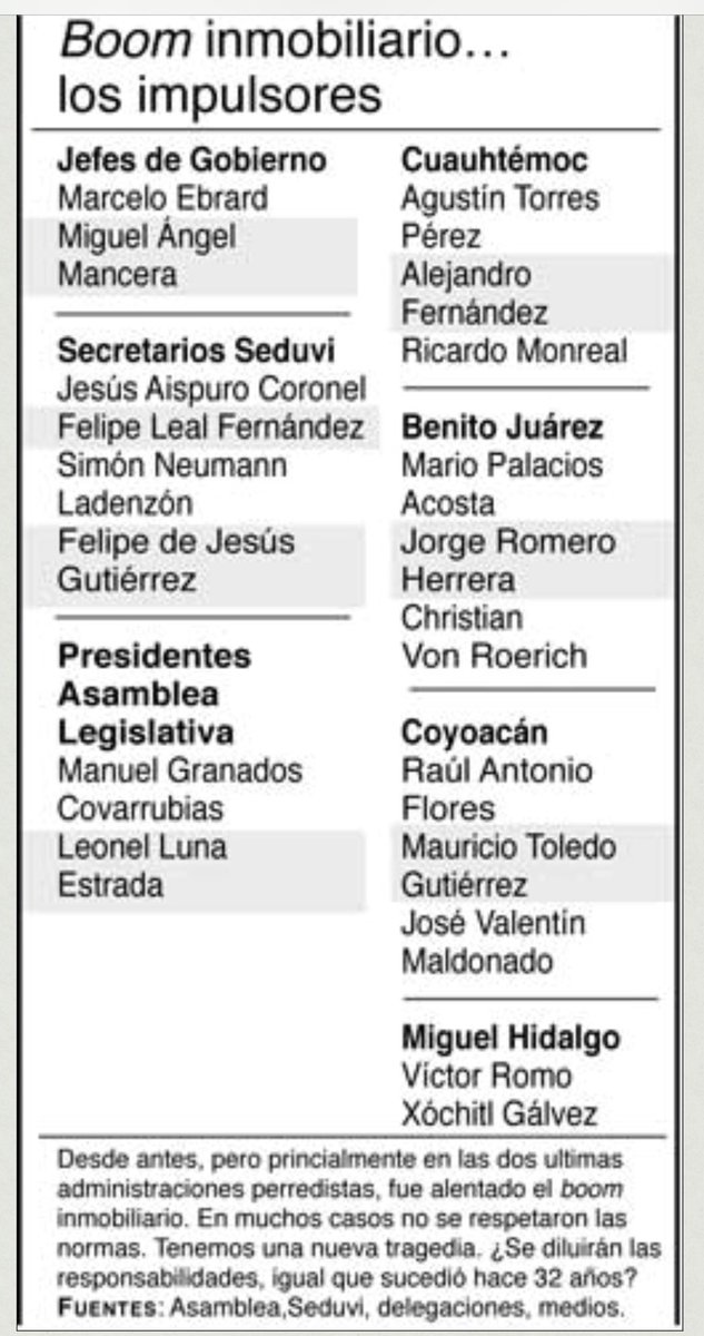 Muchos edificios están colapsados en la ciudad, A media cuadra de donde vivo, en la colonia Albert, al sureste de la ciudad, hay todavía un edificio como de seis pisos totalmente listo para ser demolido, para ser dinamitado, para ser tirado porque quedó inservible gracias al movimiento del suelo donde fueron puestos sus cimientos y habría que investigar si sus constructores cumplieron con el reglamento de construcciones del gobierno de la Ciudad,