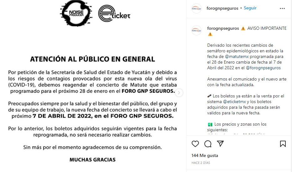 MÉRIDA.— El repunte de contagios de Covid-19, que conllevó al cambio del semáforo epidemiológico en Yucatán, de verde a amarillo, originó una serie de cambios en eventos como conciertos; uno de los primeros afectados es la presentación del grupo Matute, que se realizaría el 28 de enero en el Foro GNP Seguros.