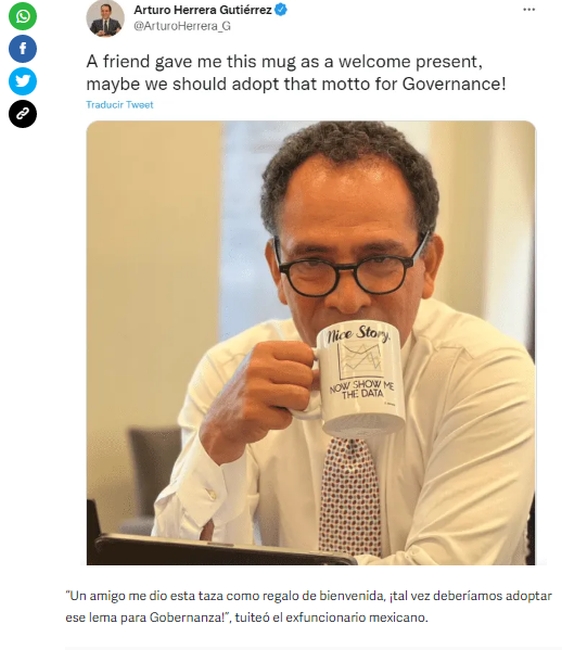En la imagen, Arturo Herrera aparece tomando una bebida en una taza que tiene la leyenda: “Nice story. Now show me the data”, cuya traducción es : “Buena historia. Ahora muéstrame los datos.”